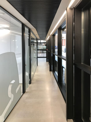 Reforma y ampliación de las oficinas de una empresa dedicada a la exportación, ubicada en un polígono industrial de Nules (Castellón). Los despachos de esta nave industrial se situaban en planta baja, quedando el resto de la altura de la nave sobre los mismos desaprovechada. Se plantea una reforma completa de los espacios existentes y el aumento de una planta dentro del volumen de la nave, así como la sustitución del cerramiento convencional que existía por un muro cortina, con una fachada principal inclinada, para dotarlo de singularidad. En el interior se ha buscado la transparencia y la ligereza. Se ha diseñado la escalera de las oficinas en vidrio y acero, con una viga descentrada que soporta los peldaños. En el techo del hall se ha optado por instalar un falso techo tensado de efecto espejo, para potenciar la transparencia del conjunto. En la sala de reuniones se ha colocado un techo tensado traslúcido que, cuando se ilumina desde el interior, emite una luz difusa en toda su extensión.